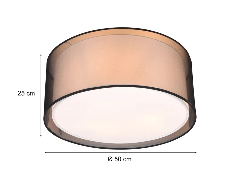 Der äußere Stoffschirm hat einen Durchmesser von 50 cm und zusammen mit dem Korpus ist die Leuchte 25 cm hoch. Sie ist ausschließlich zur Deckenmontage geeignet.
