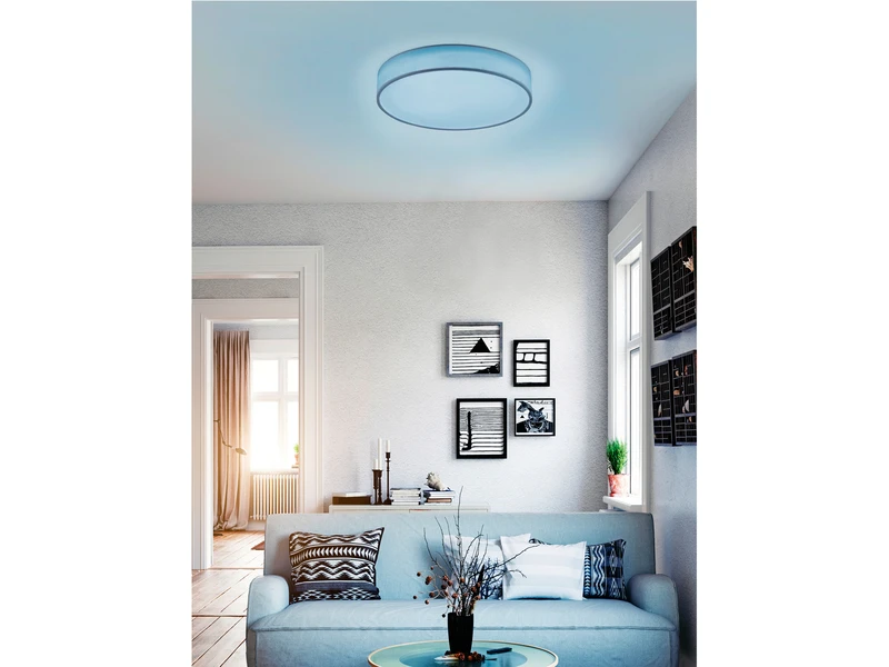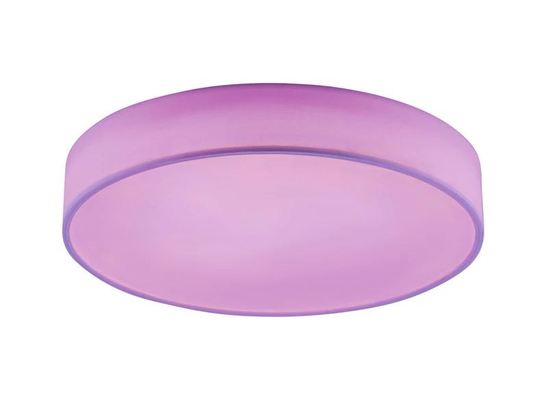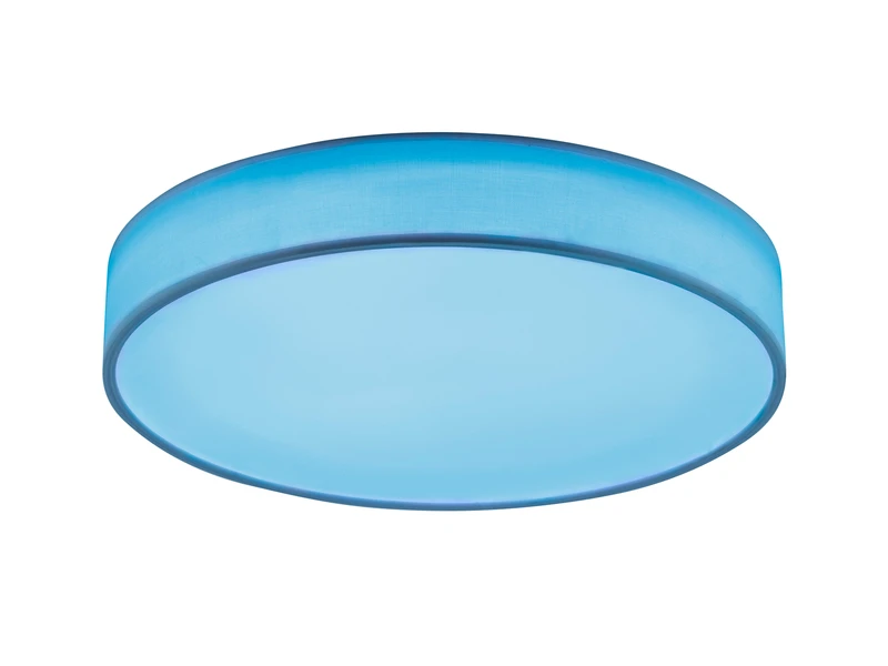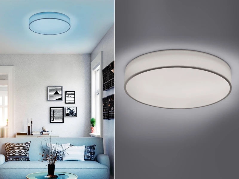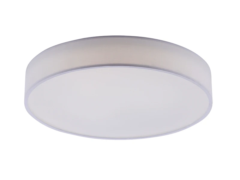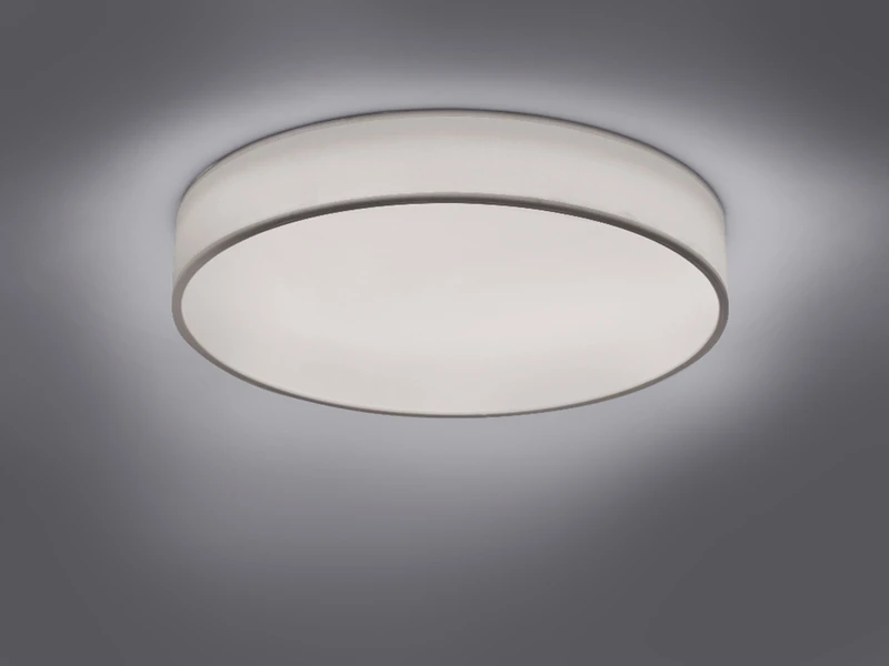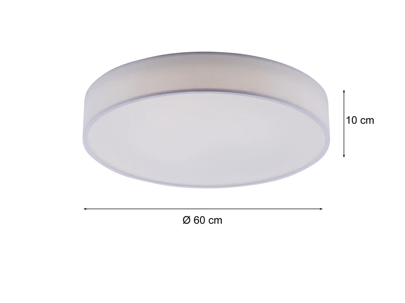 Die Leuchte hat einen Durchmesser von 60cm, und ist mit 10cm sehr flach. Der weiße Stoffschirm sorgt für bestmögliche Lichtergebnisse und lässt sich stilvoll in verschiedene Wohnkonzepte integrieren.