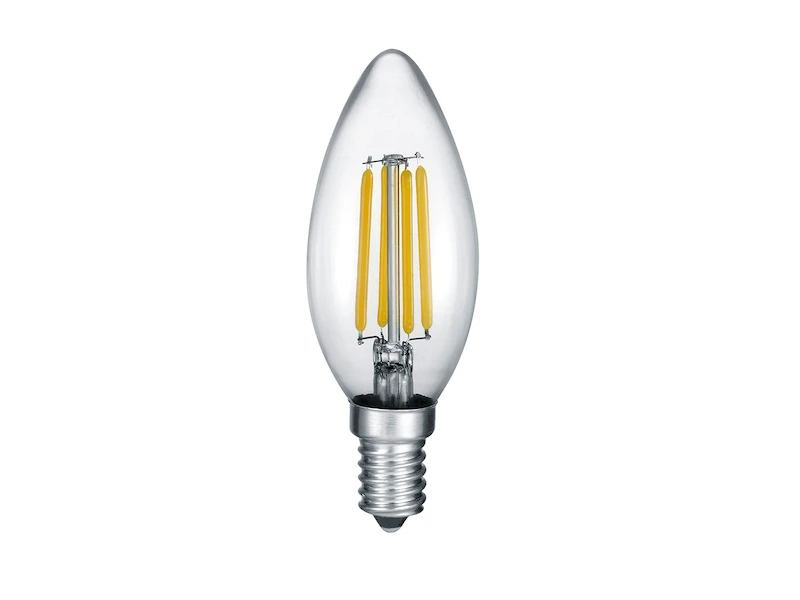Dieses Filament LED in Kerzenform hat eine Leistung von 4,5 Watt, 470 Lumen, und verbreitet mit 2700 Kelvin ein warmweißes Licht. Mit seiner langen Lebensdauer ist es um ein vielfaches sparsamer als ein herkömmliches Leuchtmittel.