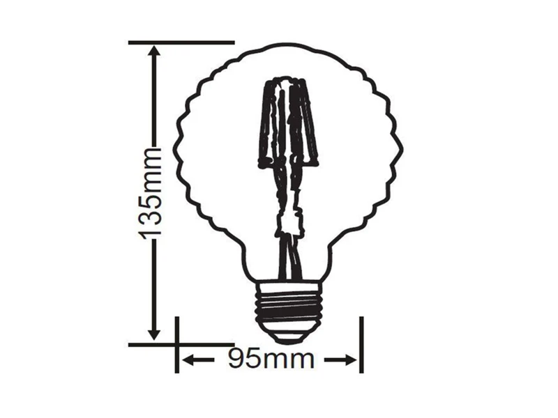 Das Leuchtmittel hat einen Durchmesser von 9,5 cm, eine Höhe von 13,5 cm, und verleiht mit seinem gemusterten Korpus aus amberfarbigem Glas jeder Leuchte den ultimativen Glow.