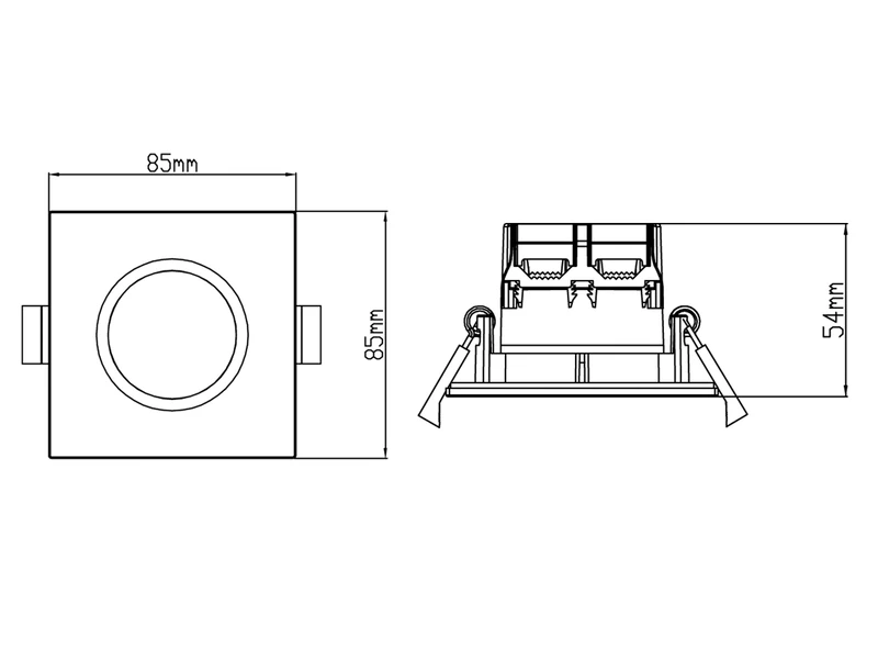 Die quadratische Einbaulampe aus Metall hat eine Größe von 8,5 x 8,5 cm und eine Höhe von 5,4 cm. Für den Einbau wird ein 7,2 cm großer Ausschnitt und eine Einbautiefe von min. 6,8 cm benötigt.