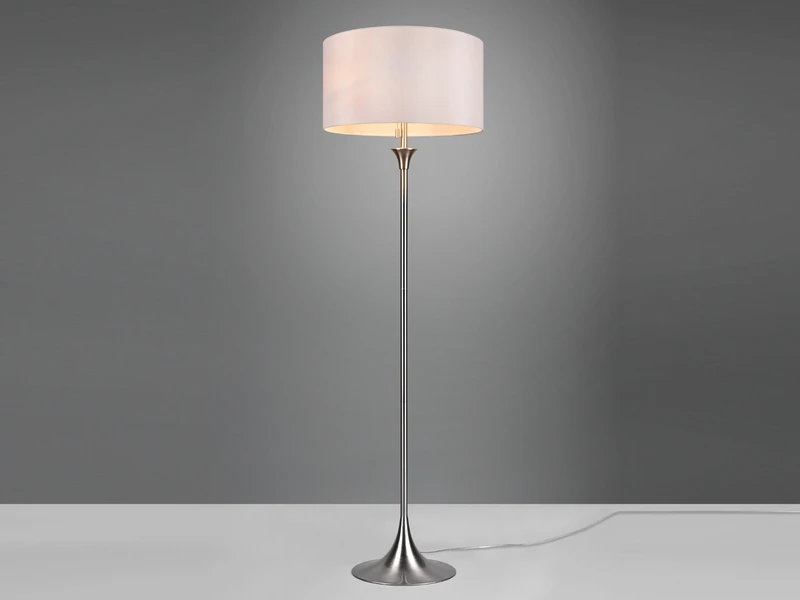 Die große Standleuchte sorgt mit ihrem Textilschirm für eine stimmungsvolle Atmosphäre und Behaglichkeit. Der edle Stoffschirm in Weiß in Kombination mit dem eleganten geschwungenen Leuchtenfuß aus Metall in Silber matt vermitteln ein harmonisches Gesamtbild. Mit einer Höhe von 155 cm sowie einem Schirm-Durchmesser von 45 cm passt sich die große Lampe ihrer Umgebung dezent an und sorgt für ein gemütliches Licht.