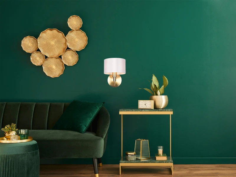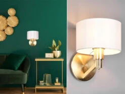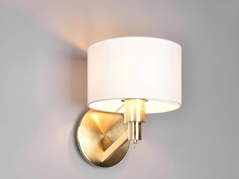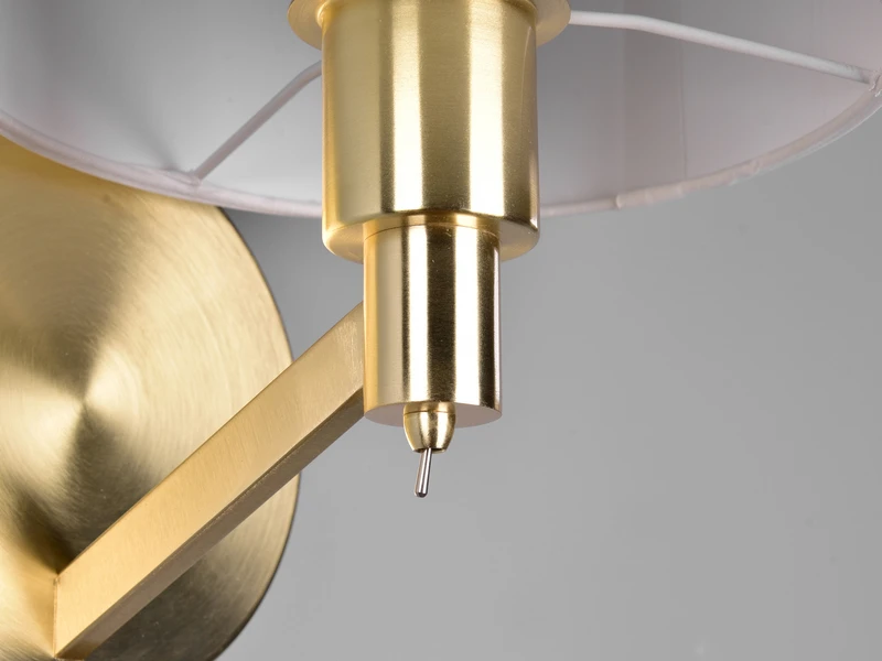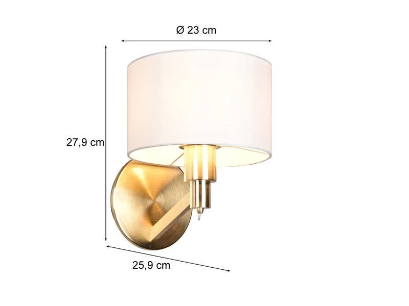 Die Wandleuchte CASSIO sorgt mit ihrem Textilschirm für eine stimmungsvolle Atmosphäre und Behaglichkeit. Das schlichte und edle Design in Messing matt mit weißem Stoffschirm setzt dekorative Akzente in Ihrem Zuhause. Mit einer Höhe von 27,9 cm sowie einer Wandausladung von 25,9 cm passt sich die zierliche Lampe ihrer Umgebung dezent an und sorgt für ein gemütliches Licht.