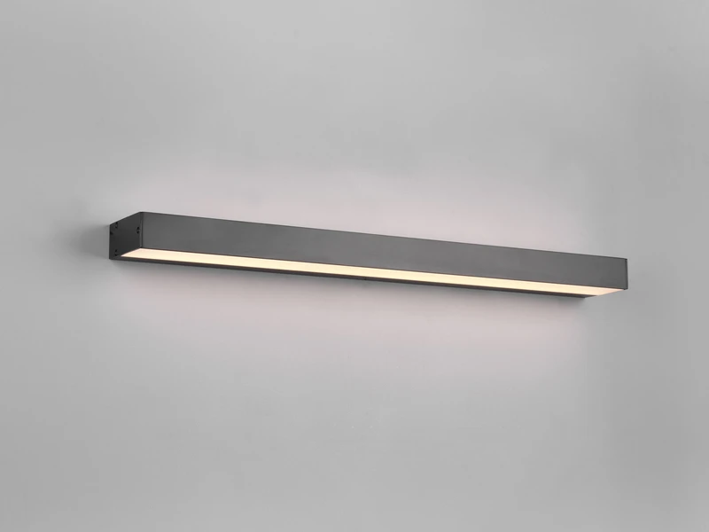 Der Schwarz matte Korpus verleiht der Badezimmer Lampe eine dezente Optik. Mit einer Breite von 60 cm und einer Ausladung von 8cm kommt sie auch in großen Bäder gut zur Geltung und überzeugt durch effektives, aber dennoch blendfreies Licht.
