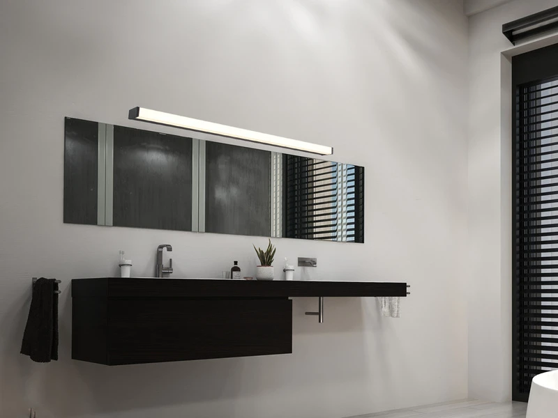 Der Schwarz matte Korpus verleiht der Badezimmer Lampe eine dezente Optik. Mit einer Breite von 120 cm und einer Ausladung von 7,9cm kommt sie auch in großen Bäder gut zur Geltung und überzeugt durch effektives, aber dennoch blendfreies Licht.