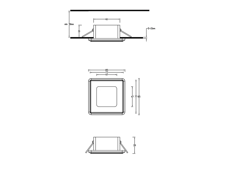 Die Einbaulampe aus Kunststoff hat bei einer Höhe von 3cm eine Breite und Tiefe von jeweils 8cm. Für den Einbau werden ein 7,5cm großer runder Ausschnitt und eine Einbautiefe von mindestens 5cm benötigt.