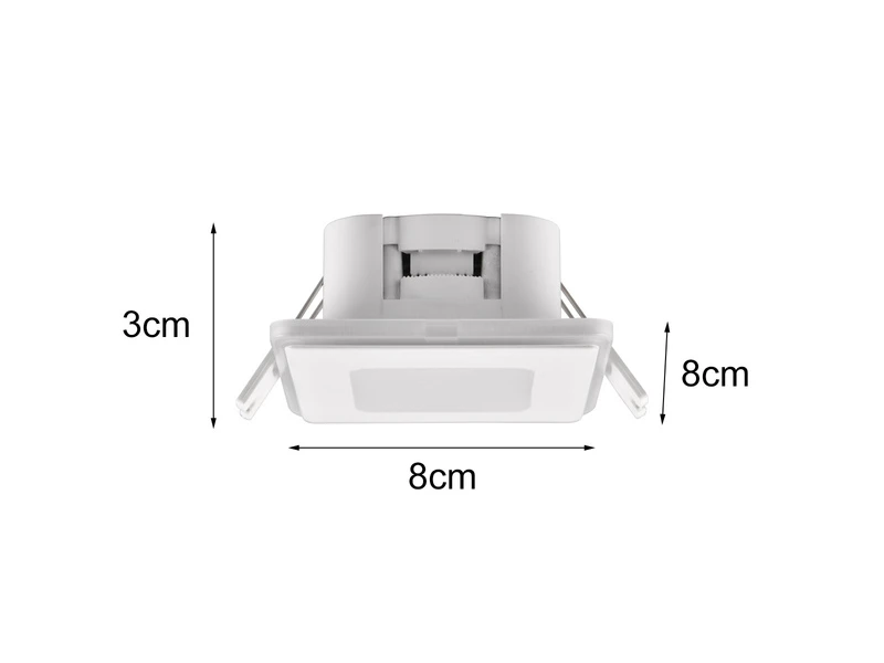 Die Einbaulampe aus Kunststoff hat bei einer Höhe von 3cm eine Breite und Tiefe von jeweils 8cm. Für den Einbau werden ein 7,5cm großer runder Ausschnitt und eine Einbautiefe von mindestens 5cm benötigt.