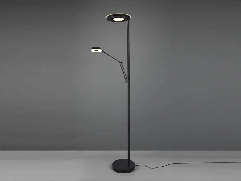 Die Farbgestaltung in Schwarz matt lässt sich sowohl in klassischen, als auch in modernen Wohnräumen wunderbar integrieren. Die Standlampe ist mit einem fest verbauten SMD-LED Modul mit 32 Watt und 4000 Lumen und einem fest verbauten SMD-LED Modul mit 6 Watt und 600 Lumen ausgestattet.
