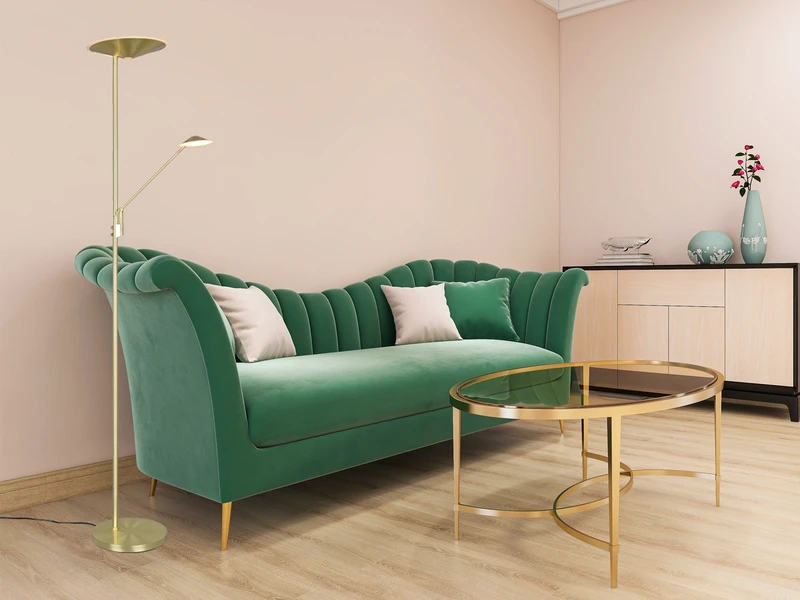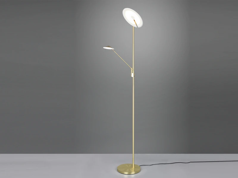 Dank der klassischen Farbgestaltung in Messing matt lässt sich die 180 cm hohe Leuchte mit vielen Einrichtungsstilen kombinieren.