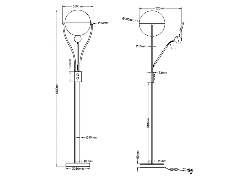 Die Leuchte hat eine Höhe von 180cm, der Fluter hat einen Durchmesser von 30cm und kann um 360° gedreht werden. Das chromfarbene Metall steht für Zeitlosigkeit und Modernität. Des Weiteren kann es gut mit anderen Farben und Materialien kombiniert werden.