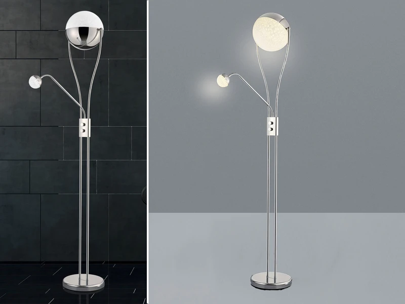 Das Design der klassischen Stehleuchte wird durch die kugelförmigen Lichtquellen mit Kristall Effekt aufgewertet und macht den Deckenfluter zu einem modernen Dekoelement.