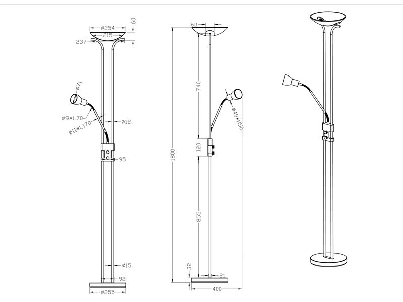 Die Stehleuchte hat eine Höhe von 180 cm und eine Breite von 25,5 cm.