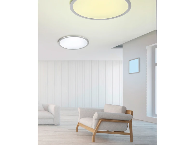 Durch die zeitlose Optik und das flache Design, von nur 5cm, eröffnen sich zahlreiche Anwendungs- und Gestaltungsmöglichkeiten. Der Rahmen der Leuchte in Silber matt und die Kunststoffabdeckung in Weiß lassen sich stilvoll in verschiedene Wohnkonzepte integrieren. Ganz gleich ob Sie auf der Suche nach Wohnzimmerlampen, Küchenlampen, Esszimmerlampen oder auch nach modernen Bürolampen sind, all diesen Ansprüchen wird die Deckenleuchte in jeder Hinsicht gerecht.