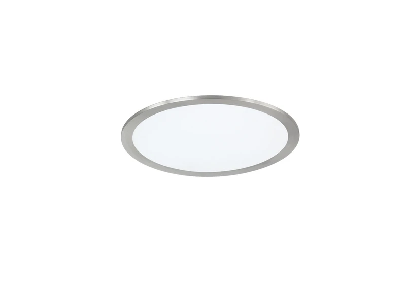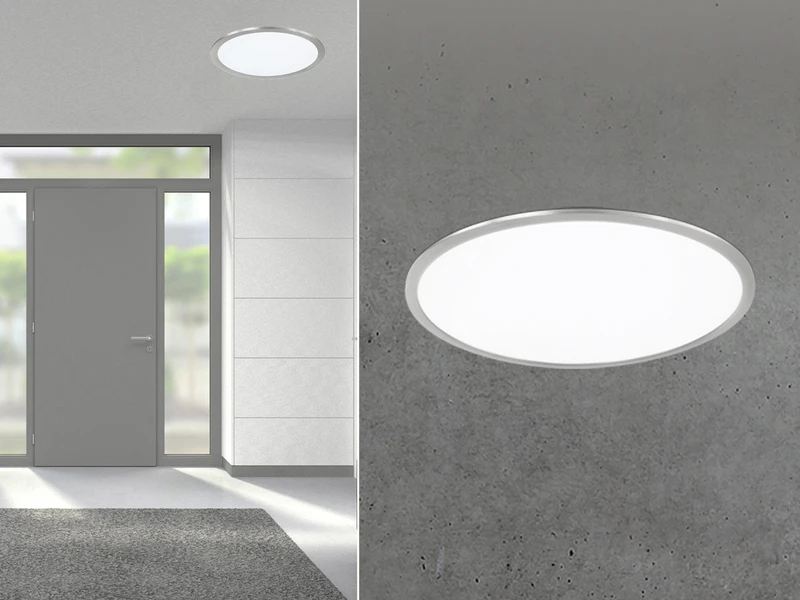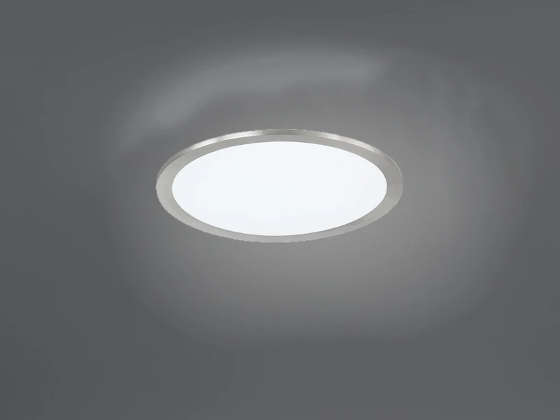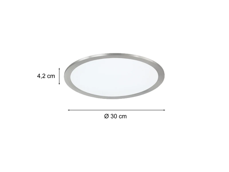 Die Leuchte ist aus weißen Kunststoff und einem Metall-Rand in Silber matt gefertigt und sorgt für ein angenehmes, warmes Lichtambiente, das Sie nicht blendet. Mit einem Durchmesser von 30 cm und einer Höhe von nur 4,2 cm ist die Lampe zur Decken- und Wandmontage geeignet.