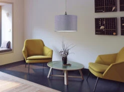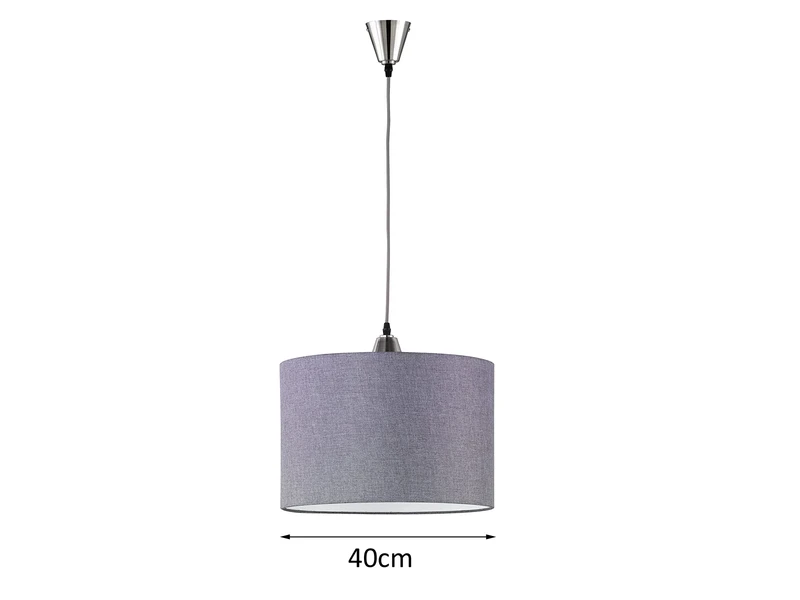 Das Kennzeichnende der Pendelleuchte ist der graue Lampenschirm aus Stoff. Mit einem Durchmesser von 40 cm sorgt er für ein angenehmes Licht und verleiht der Hängelampe einen wohnlichen Charakter. Die Abhängung ist aus mattem Nickel gefertigt und 150 cm lang. Sie komplettiert das elegante Gesamterscheinungsbild der Hängeleuchte.