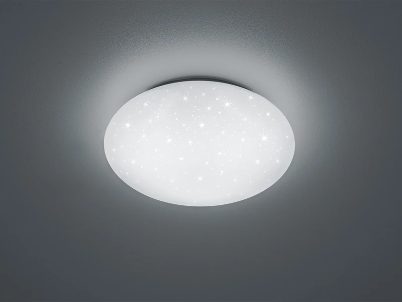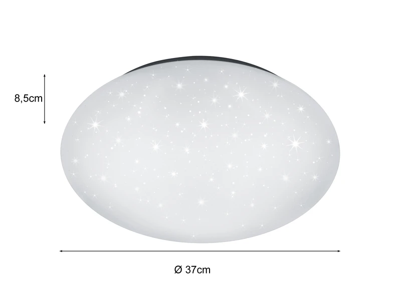 Die Deckenleuchte hat eine Höhe von 8,5 cm und einen Durchmesser von 37 cm. Dadurch kann die flache Lampe auch perfekt zur Wandbeleuchtung genutzt werden. Der weiße Lampenschirm sorgt für ein blendfreies, gleichmäßig helles Licht und komplettiert mit seinem Sterneffekt das harmonische Erscheinungsbild.