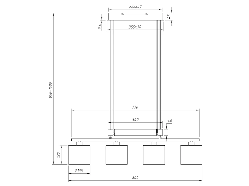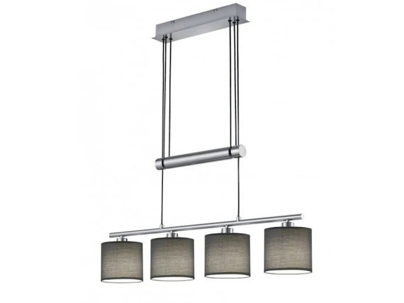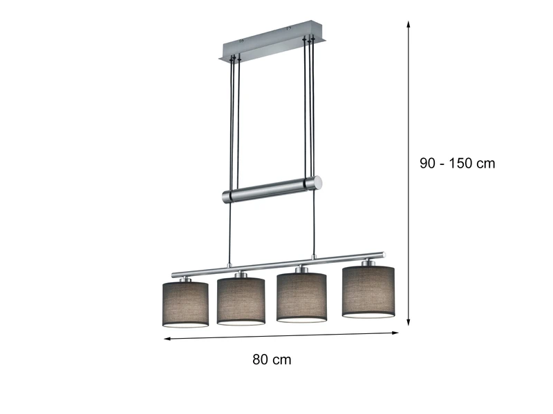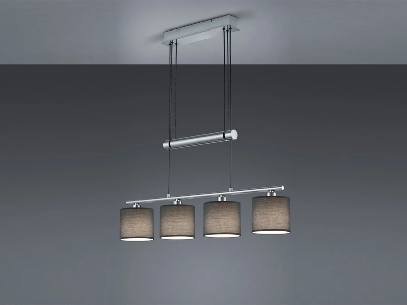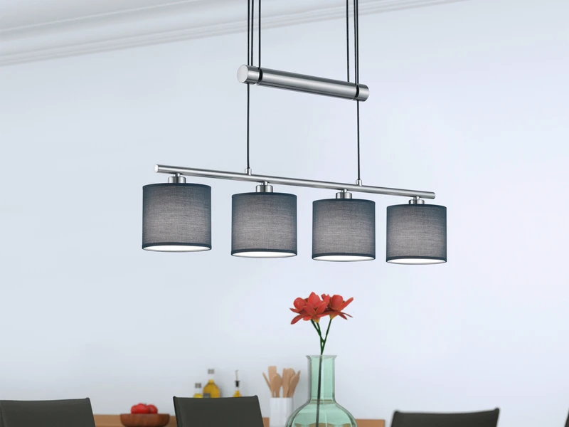 Das Kennzeichnende der 4 flammigen Pendelleuchte sind die grauen Lampenschirme aus Stoff. Mit einem Durchmesser von jeweils 13,5 cm sorgen sie für ein angenehmes Licht und verleihen der insgesamt 77 cm langen Hängelampe ihren unverwechselbaren Charakter. Der Korpus ist aus mattem Nickel gefertigt. Er komplettiert das elegante Erscheinungsbild der Hängeleuchte.