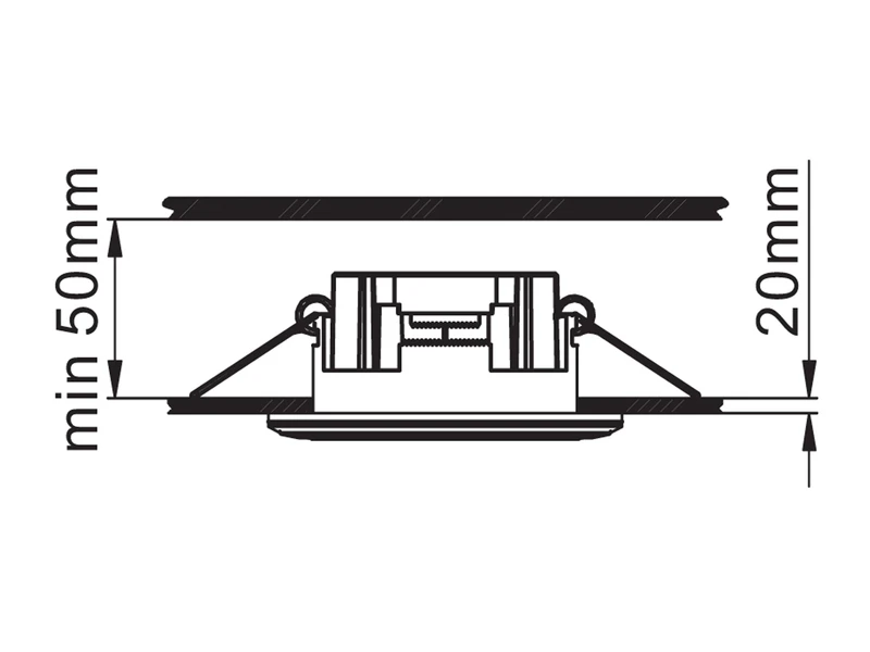Die Einbaulampe aus Kunststoff hat einen Durchmesser von 8,2 cm und eine Höhe von 4 cm. Für den Einbau wird ein 6,8 cm großer Ausschnitt und eine Einbautiefe von min. 5 cm benötigt.