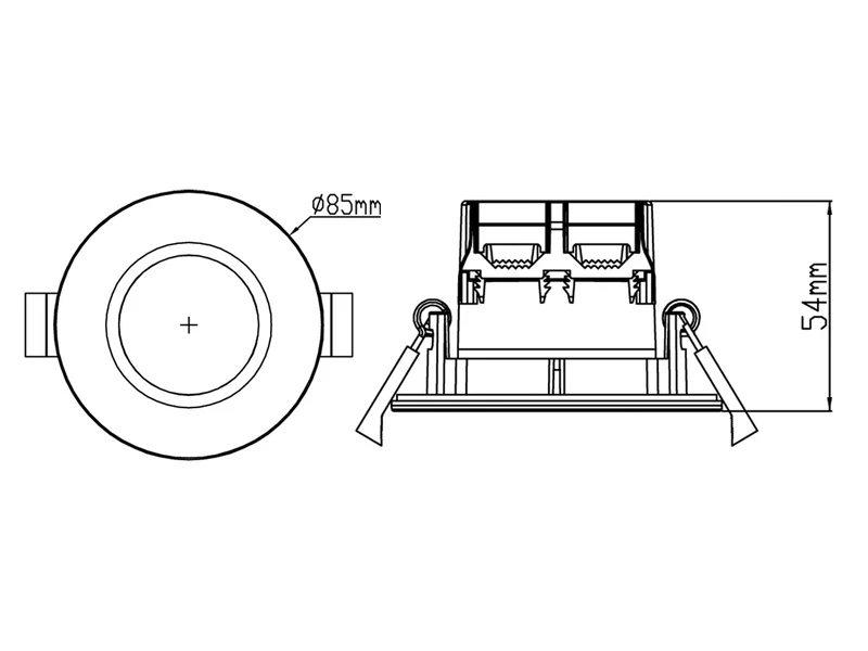 Die runde Einbaulampe aus Metall hat einen Durchmesser von 8,5 cm und eine Höhe von 5,4 cm. Für den Einbau wird ein 7,2 cm großer Ausschnitt und eine Einbautiefe von min. 6,8 cm benötigt.