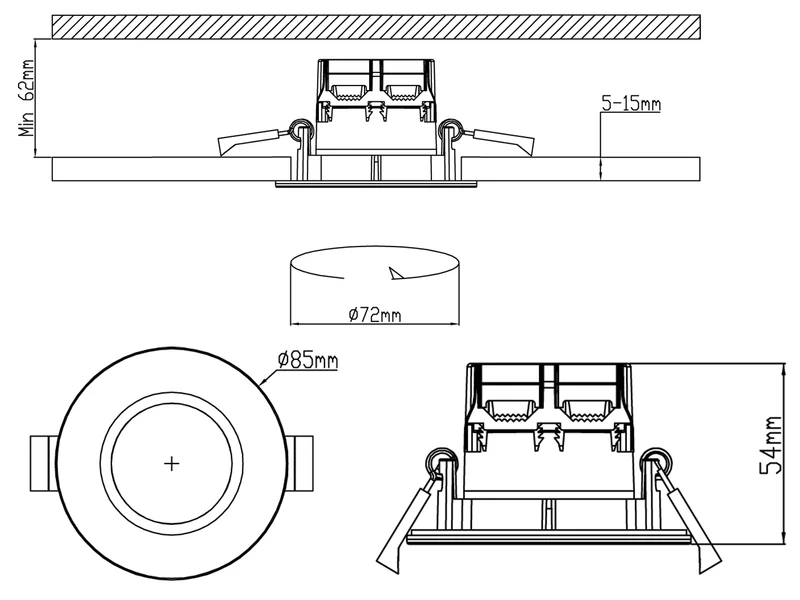Die runden Einbaulampen aus Metall haben einen Durchmesser von 8,5 cm und eine Höhe von 5,4 cm. Für den Einbau wird ein 7,2 cm großer Ausschnitt und eine Einbautiefe von min. 6,2 cm benötigt.