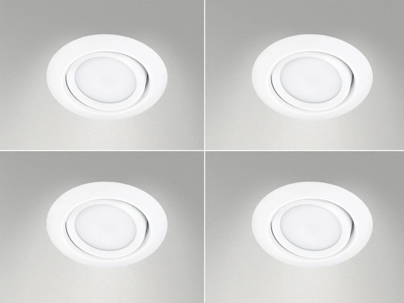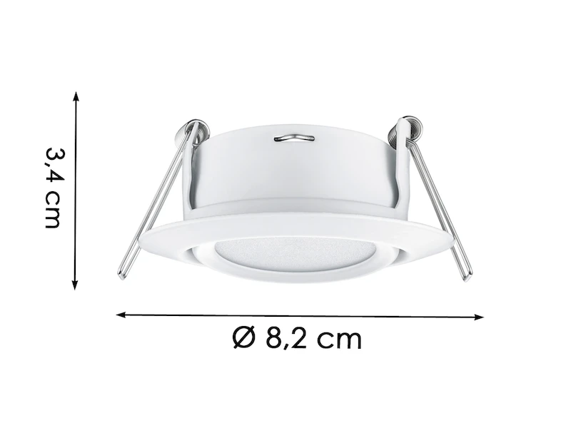 Gefertigt sind die Deckenlampen aus Weiß mattem Metall. Der Spot hat einen Durchmesser von 8,2 cm sowie eine Einbautiefe von 5 cm und lässt sich individuell ausrichten.