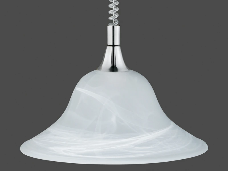 Die Zugpendelleuchte ist per Rollyzug höhenverstellbar von 70 bis 130cm. Der Baldachin und die Lampenfassung bestehen aus Silber Chrom glänzend, der weit ausladende Lampenschirm mit einem Durchmesser von 38,5cm besteht aus Milchglas in der Farbe weiß gewischt und sorgt für eine gute Ausleuchtung.