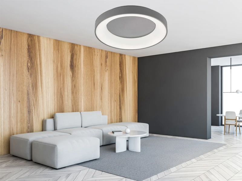 Das schlichte, ringförmige Design der Lampe ergänzt klassische und moderne Einrichtungen und lässt sich vielseitig einsetzen. Die Oberfläche in Dunkelgrau ermöglicht ein leichtes Integrieren in vorhandene Einrichtungskonzepte.
