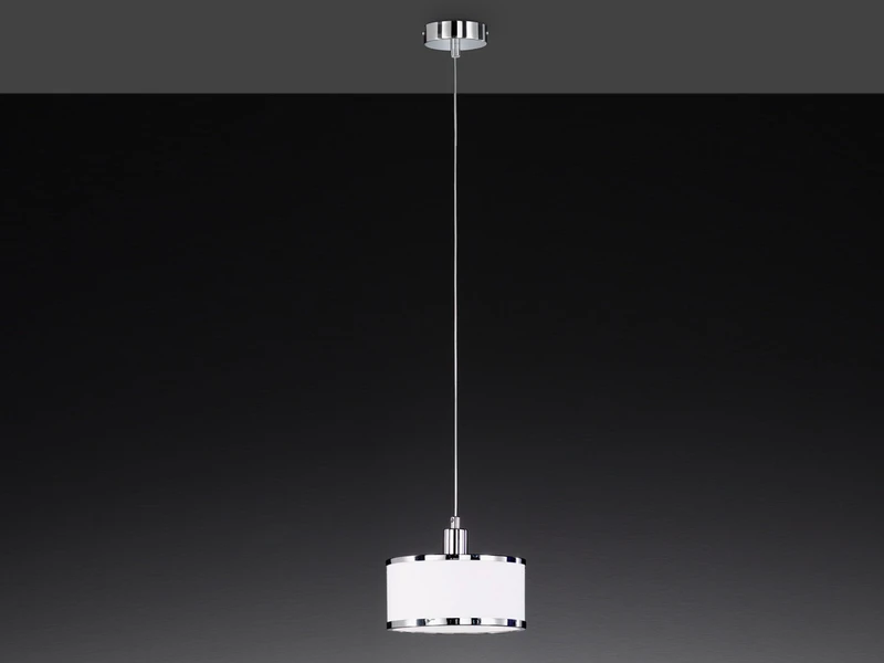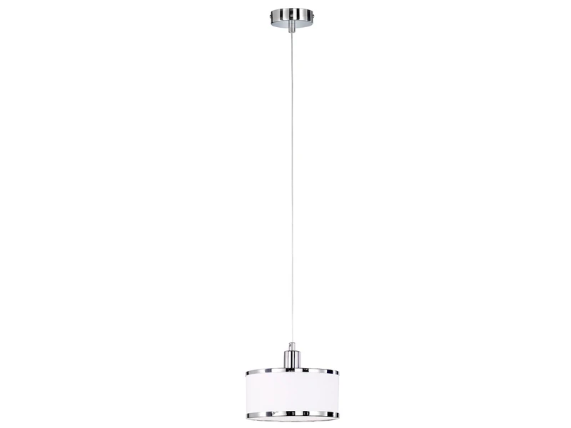 Der runde Lampenschirm aus weißem Stoff mit Applikationen in Chrom glänzend verleiht der Hängeleuchte ihren ganz eigenen, stilvollen Charakter. Mit einem Schirmdurchmesser von 20 cm sowie einer Chrom glänzenden Abhängung kommt das schöne Design der Pendelleuchte angenehm zur Geltung.